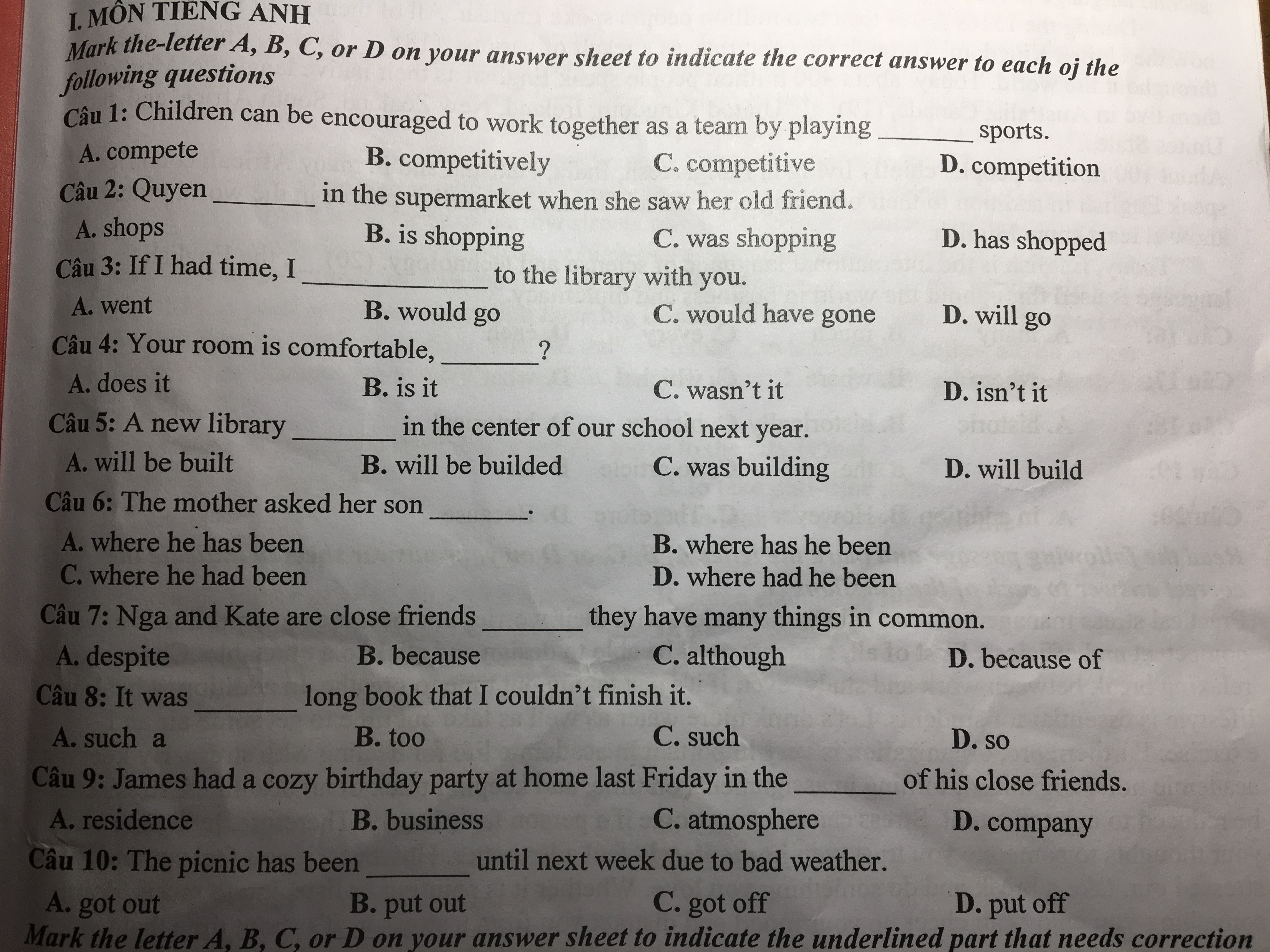 Mark the letter a b c or d on your answer sheet to indicate the correct answer to each of the following questions