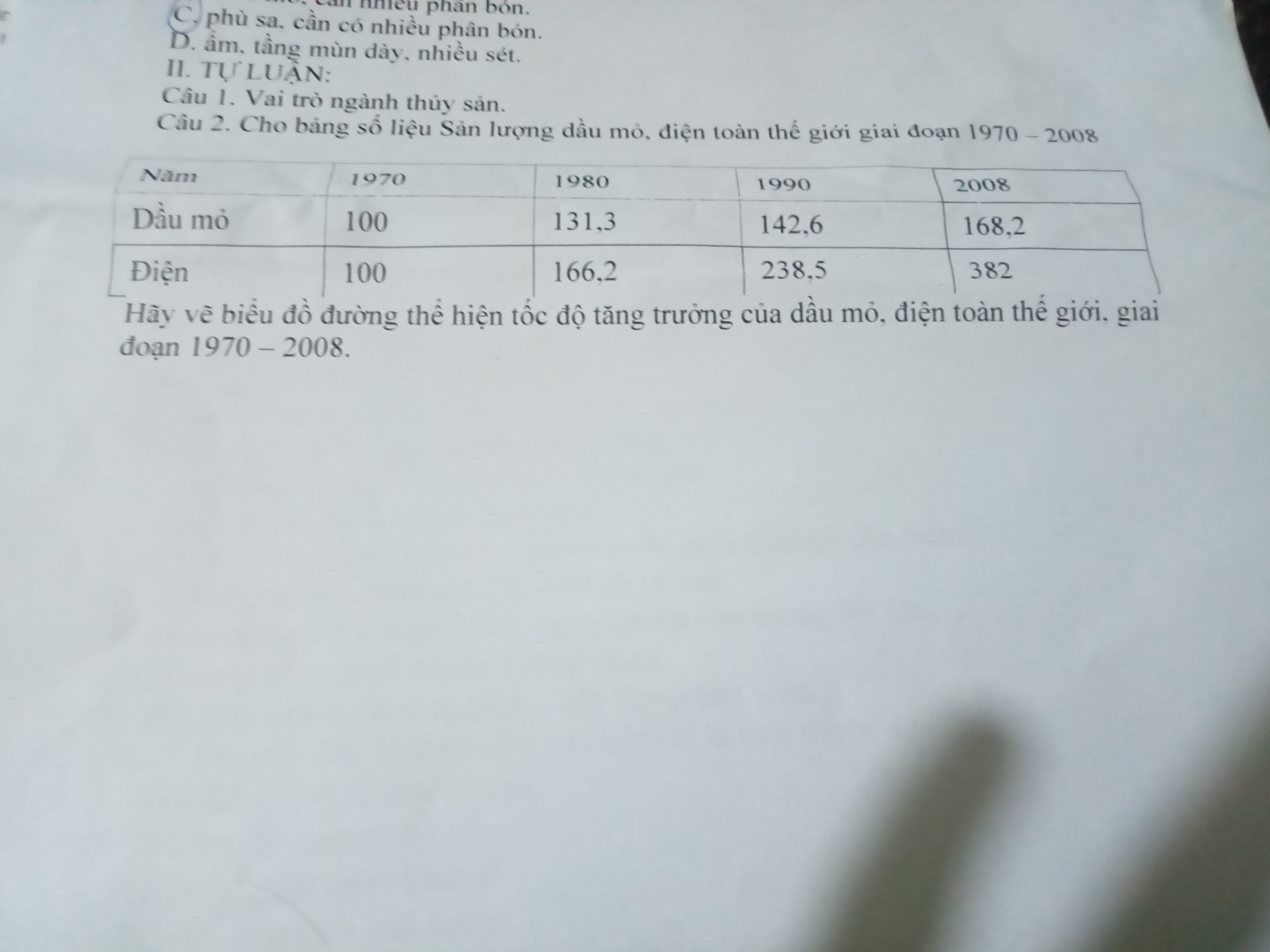 Cho bảng số liệu sản lượng dầu mỏ, điện toàn thế giới giải đoạn 1970 - 2008