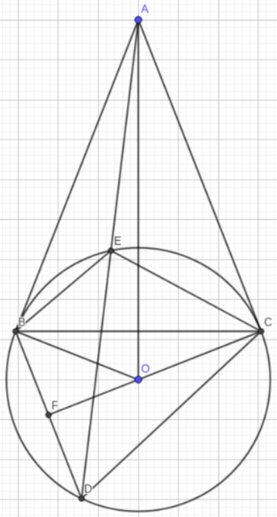 Cho đường tròn (O; R). Từ điểm A nằm ngoài đường tròn kẻ hai tiếp tuyến AB, AC với đường tròn (B, C là hai tiếp điểm). Từ B kẻ đường thẳng song song với AC cắt (O) tại D (D khác B), đường thảng AD cắt (O) tại E (E khác D)