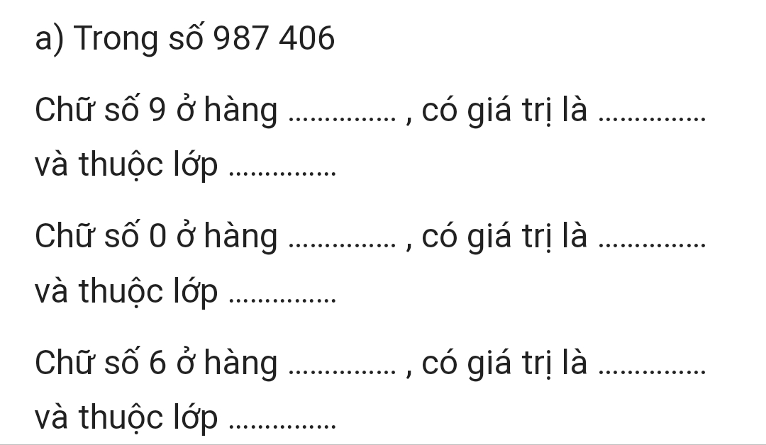 Chữ số 6 ở hàng ...... , có giá trị là .... và thuộc lớp ......