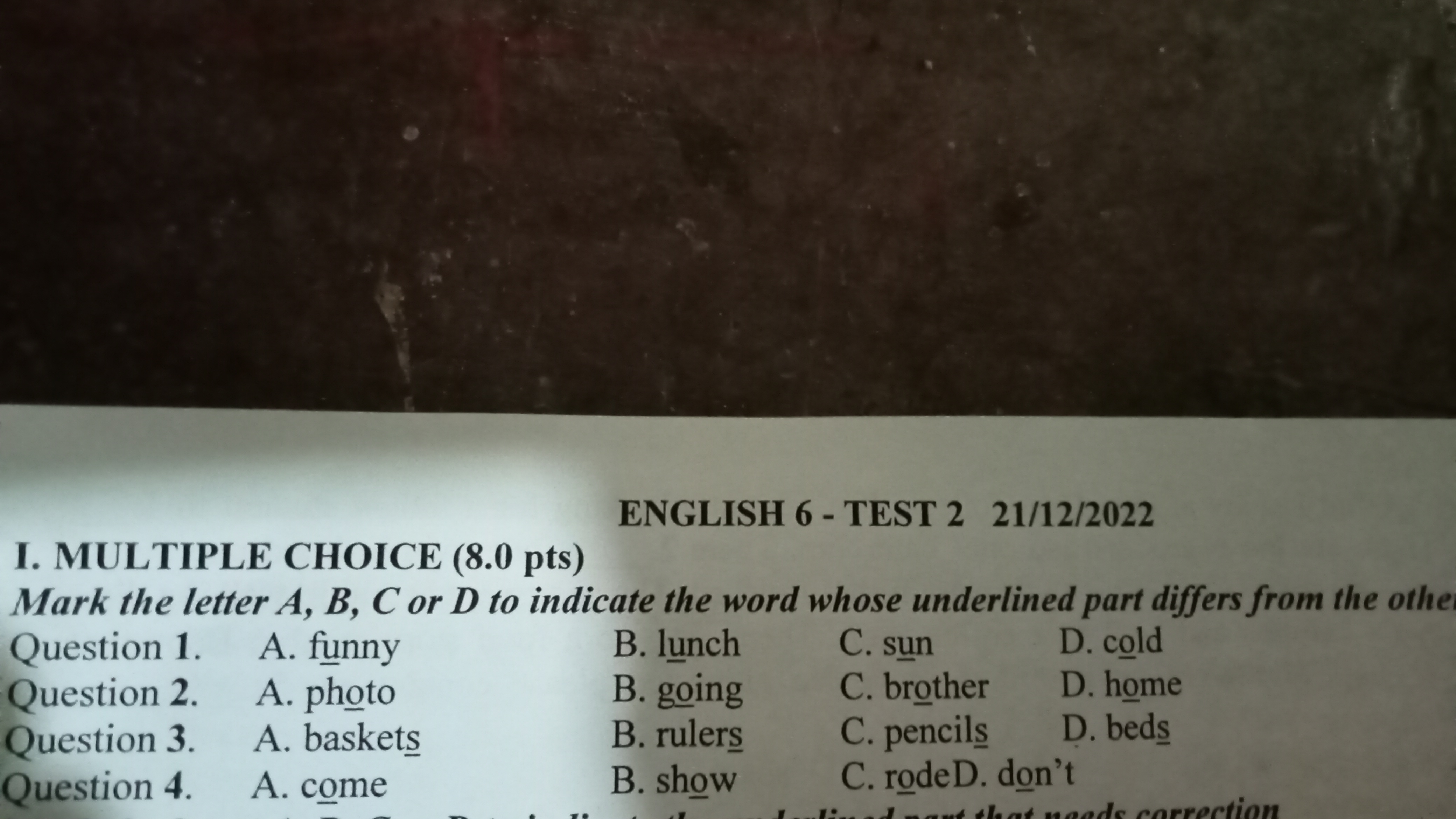 Chọn từ phát âm khác: A. funny B. lunch C. sun D. cold