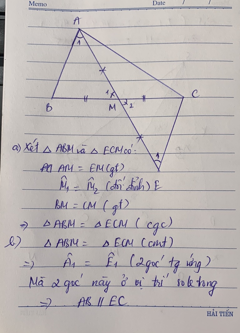Cho tam giác ABC đường trung tuyến AM. Vẽ điểm E sao cho M là trung điểm AE