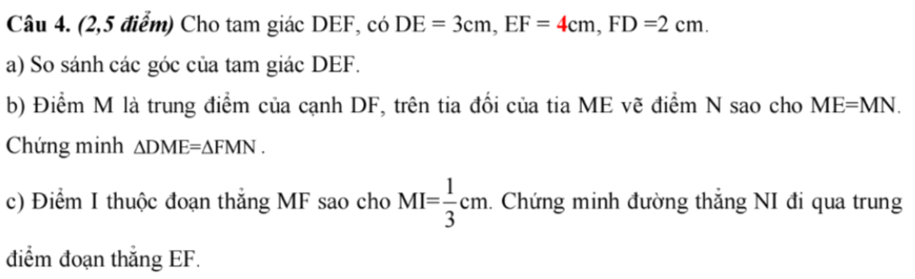 Cho tam giác DEF, DE = 3cm, EF = 4cm, FD = 2cm