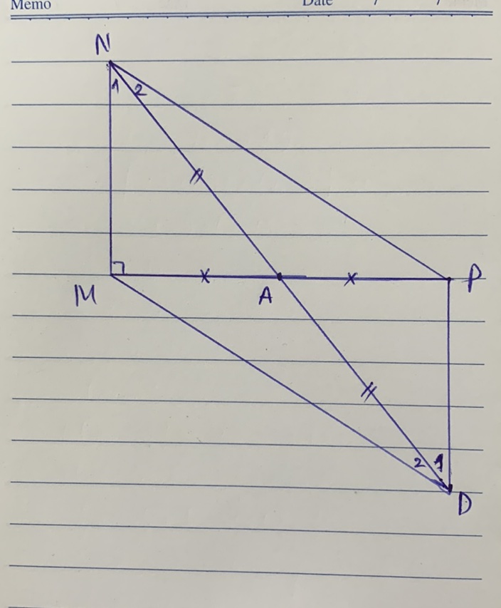 Cho tam giác MNP vuông tại M có A là trung điểm của cạnh MP, trên tia đối của AN lấy điểm D sao cho AD = AN chứng minh: MN= PD; MP vuông góc với DP; MN //PD; MD= NP; MD //NP