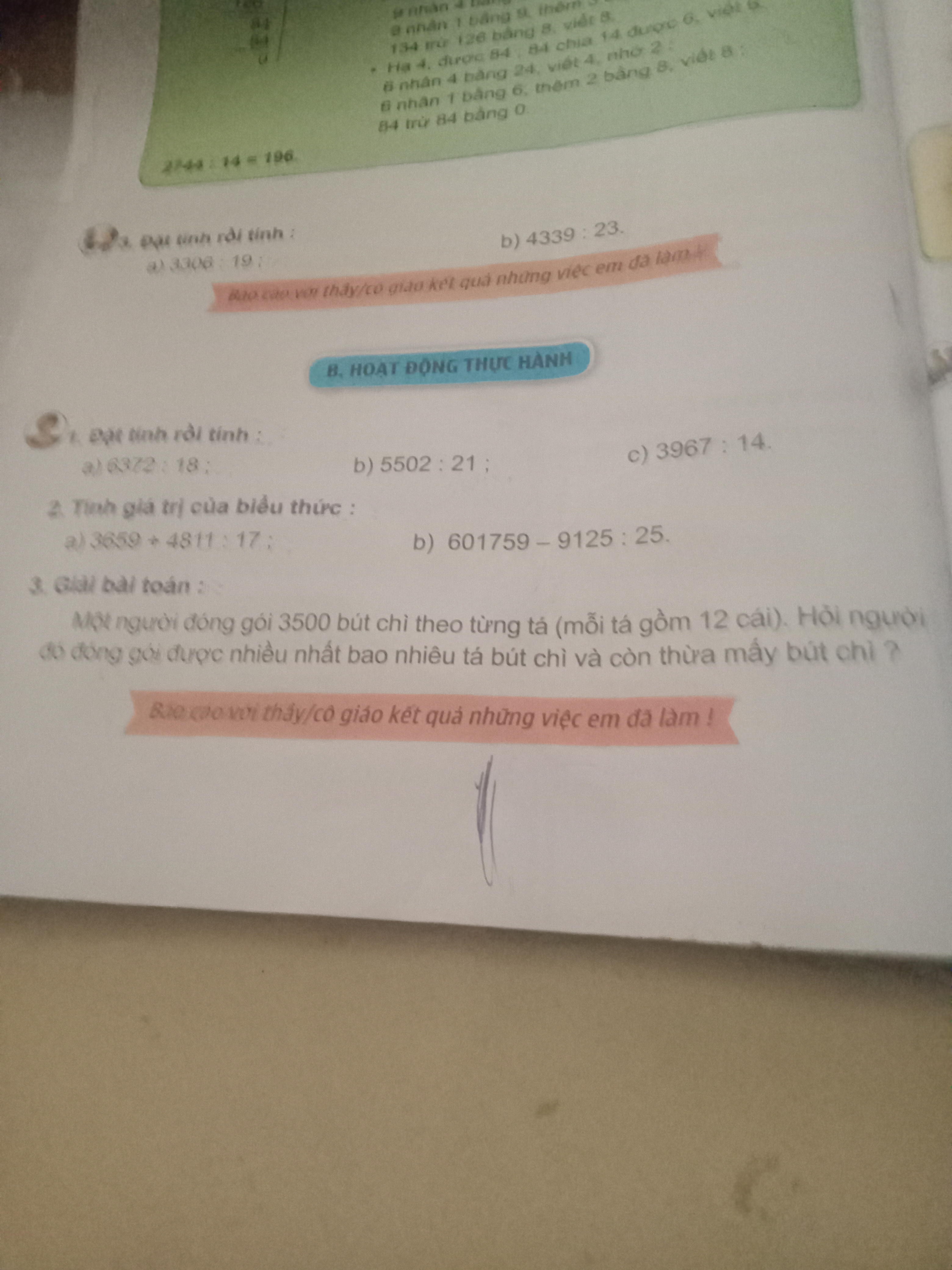 Một người đóng gói 3500 bút chì theo từng tá (mỗi tá gồm 12 cái). Hỏi người đó đóng gói được nhiều nhất bao nhiêu tá bút chì và còn thừa bao nhiêu cái bút chì?