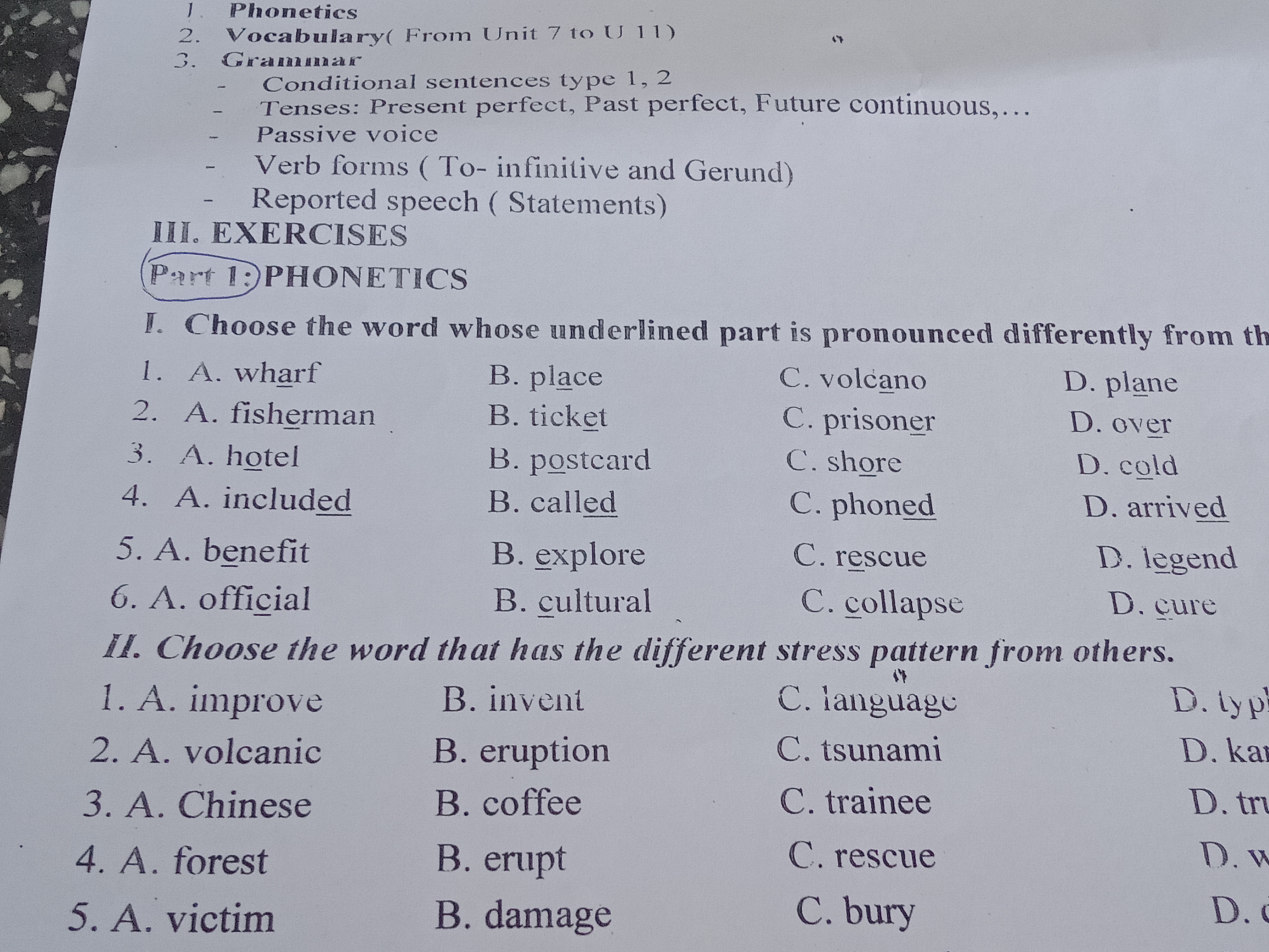 Choose the word whose underlined part is pronounced differently: A. wharf