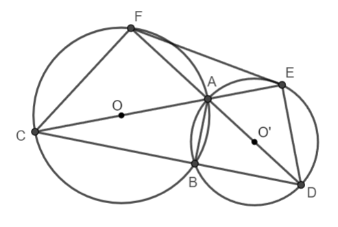 Bài 2: Cho hai đường tròn (O) và (O’) cắt nhau tại A và B. Đường thẳng AO cắt (O) tại E và đường thẳng AO’ cắt (O’) tại F. Chứng minh rằng E, B, F thẳng hàng.