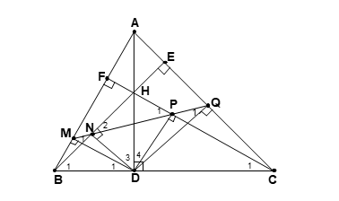 Bài 6: Cho tam giác nhọn ABC , Kẻ các đường cao AD, BE, CF. Gọi H là trực tâm của tam giác. Gọi M, N, P, Q lần lượt là các hình chiếu vuông góc của D lên AB, BE, CF, AC. Chứng minh :