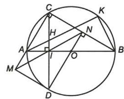 Bài 5: Cho đường tròn (O) đường kính AB. Trên đoạn thẳng OB lấy điểm H bất kì (H không trùng O, B); trên đường thẳng vuông góc với OB tại H, lấy một điểm M ở ngoài đường tròn; MA và MB thứ tự cắt đường tròn (O) tại C và D. Gọi I là giao điểm của AD và BC.