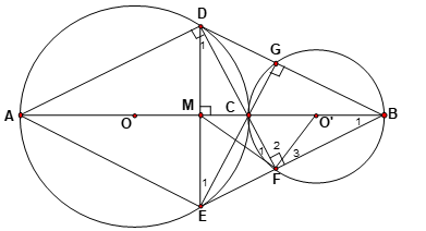 Bài 6: Cho đường tròn (O; R) và (O’; R’) có R > R’ tiếp xúc ngoài nhau tại C. Gọi AC và BC là hai đường kính đi qua điểm C của (O) và (O’). DE là dây cung của (O) vuông góc với AB tại trung điểm M của AB. Gọi giao điểm thứ hai của DC với (O’) là F, BD cắt (O’) tại G. Chứng minh rằng:1. Tứ giác MDGC nội tiếp .
