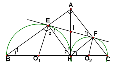 Bài 1: Cho tam giác ABC vuông tại A (AB > AC), đường cao AH. Trên nửa mặt phẳng chứa A bờ BC vẽ nửa đường tròn tâm O đường kính BH cắt AB tại E và nửa đường tròn đường kính HC cắt AC tại F. Chứng minh tứ giác AEHF là hình chữ nhật