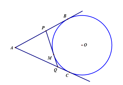 Bài tập 2. Từ một điểm A ở bên ngoài đường tròn (O), kẻ hai tiếp tuyến AB và AC với đường tròn. Từ một điểm M trên cung tròn trên cung nhỏ BC kẻ một tiếp tuyến thứ ba cắt hai tiếp tuyến kia tại P và Q. Chứng minh rằng khi M chuyển động trên cung BC thì chu vi tam giác APQ có giá trị không đổi.
