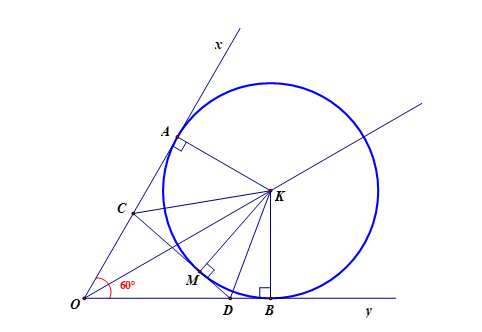 60^{o}\). Đường tròn tâm K bán kính R tiếp xúc với Ox tại A và Oy tại B. Từ điểm M trên cung nhỏ AB, vẽ tiếp tuyến với đường tròn, tiếp tuyến này cắt Ox, Oy lần lượt tại C và D.