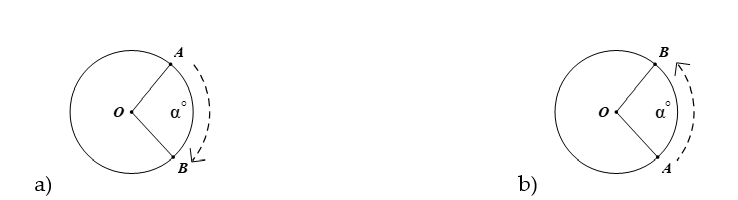 (0{^\circ} < \alpha{^\circ} < 360{^\circ})\) tâm O giữ nguyên điểm O, biến điểm A khác điểm O thành điểm B thuộc đường tròn (O; OA) sao cho tia OA quay thuận chiếu kim đồng hồ đến tia OB thì điểm A tạo nên cung AB có số đo