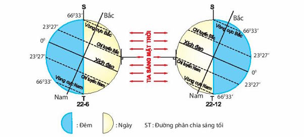 + Ngày 22 tháng 12 hiện tượng diễn ra ngược lại. Bán cầu Bắc đang là mùa lạnh, có ngày ngắn đêm dài. Cùng lúc đó, ở bán cầu Nam đang là mùa nóng, có ngày dài đêm ngắn.