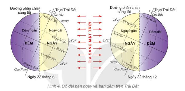 - Trong quá trình chuyển động quanh Mặt Trời, do trục Trái Đất nghiêng và không đổi hướng nên độ dài thời gian ban ngày và thời gian ban đêm có sự thay đổi theo mùa và theo vĩ độ.