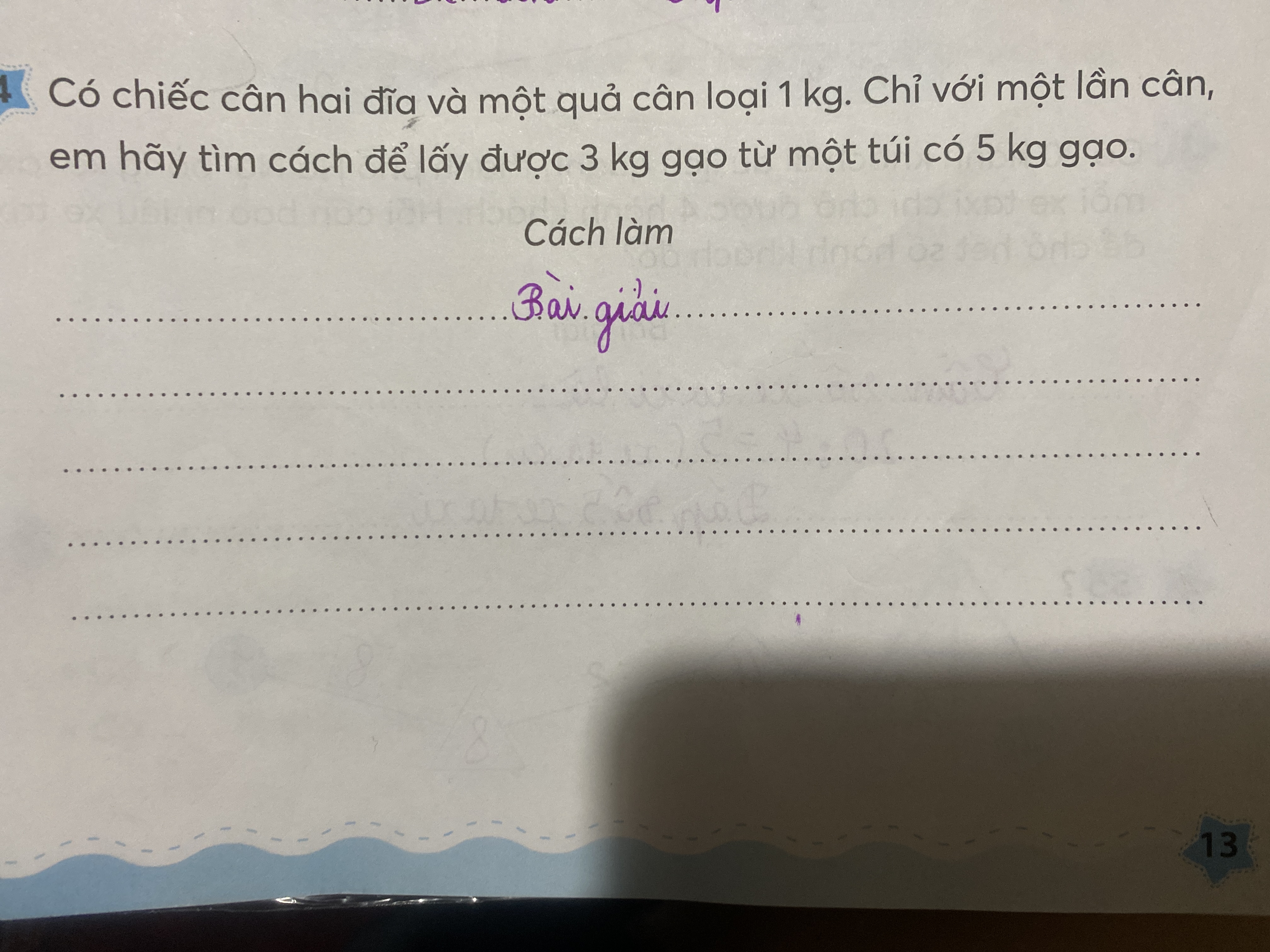 Có chiếc cân hai đĩa và một quả cân loại 1 kg, chỉ với một lần cân em hãy tìm cách để lấy được 3 kg gạo từ một túi có 5kg gạo