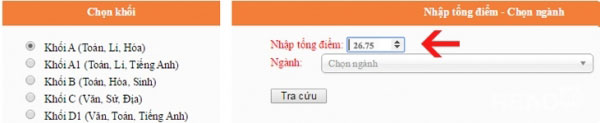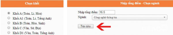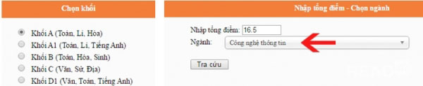 Bước 3: Chọn ngành trong danh sách ngành theo khối