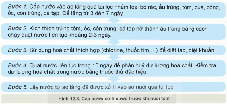 Mô tả các bước xử lí nước trước khi nuôi tôm: