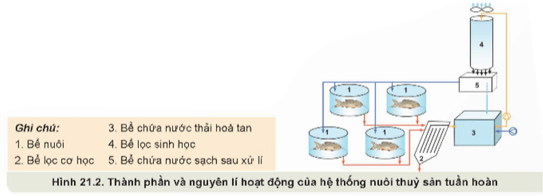 Khám phá trang 105 Công nghệ 12: Quan sát Hình 21.2, mô tả thành phần và nguyên lí hoạt động của hệ thống nuôi thủy sản tuần hoàn.