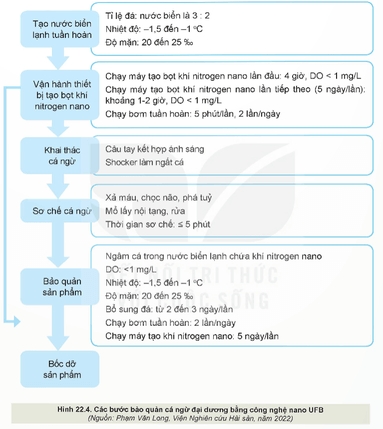 Khám phá trang 110 Công nghệ 12: Quan sát Hình 22.4 và mô tả các bước bảo quản cá ngừ đại dương bằng công nghệ nano UFB.