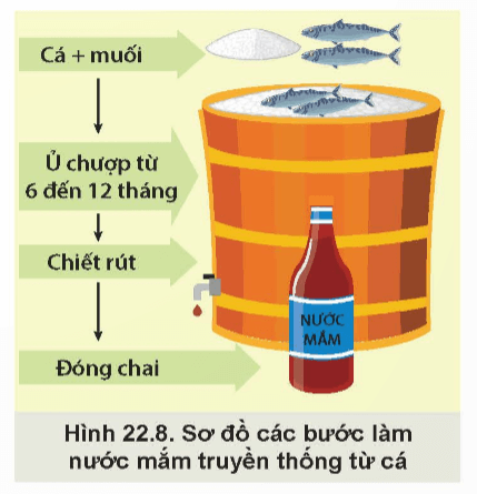 Khám phá trang 112 Công nghệ 12: Quan sát Hình 22.8 và mô tả các bước làm nước mắm truyền thống từ cá