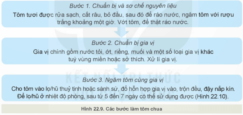 Khám phá trang 112 Công nghệ 12: Quan sát hình 22.9 và mô tả các bước làm tôm chua