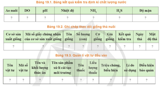 Bảng 19.1 – 19.3 được sử dụng để ghi chép, theo dõi lưu trữ thông tin cho bước quản lí và chăm sóc trong quy trình nuôi thủy sản theo tiêu chuẩn VietGAP.