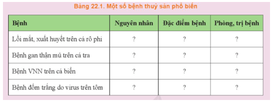 Luyện tập trang 126 Công nghệ 12: Nêu nguyên nhân, đặc điểm và cách phòng, trị một số bệnh thủy sản theo Bảng 22. 1.