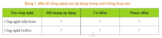 Câu hỏi 4 trang 119 Công nghệ 12: Hãy trình bày các công nghệ cao áp dụng trong nuôi trồng thuỷ sản theo mẫu Bảng 1.