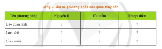 Câu hỏi 6 trang 119 Công nghệ 12: Hãy mô tả một số phương pháp bảo quản thuỷ sản theo mẫu Bảng 2.