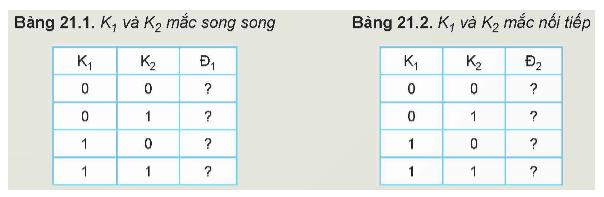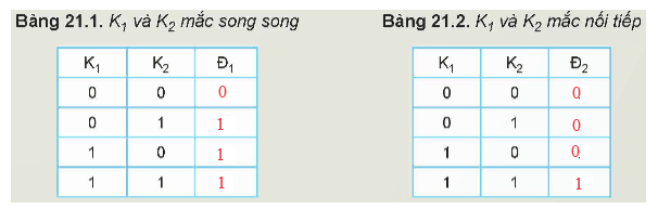 Khám phá trang 113 Công nghệ 12: Trong Hình 21.1 nếu quy ước trạng thái của các khóa K khi đóng là 1 và khi ngắt là 0 trạng thái của bóng đèn khi sáng là 1 và khi tắt là 0. Hãy hoàn thiện trạng thái của bóng đèn Đ1 và Đ2 tùy theo trạng thái của các khóa K trong hai bảng sau :