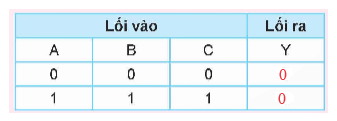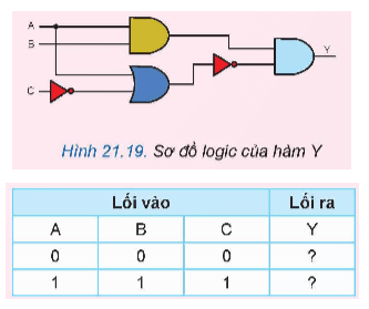Vận dụng trang 117 Công nghệ 12: Cho sơ đồ của hàm logic Y như Hình 21.19. Hãy xác định trạng thái lối ra của Y theo các lối vào A, B, C cho trong bảng dưới đây.