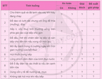 1. Quan sát căn bếp ở gia đình em và liệt kê có những vật dụng dễ cháy nổ nào chưa được thực hiện biện pháp phòng ngừa.