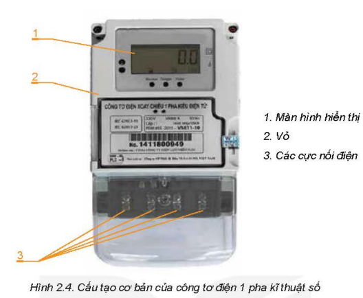 Quan sát Hình 2.4 và cho biết: Công tơ điện có những bộ phận cơ bản nào?