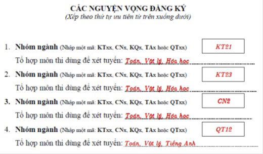 Thí sinh nên tham khảo thông tin về điểm chuẩn vào các nhóm ngành của Trường trong các năm trước để đăng ký các nguyện vọng ngành một cách phù hợp nhất. Thí sinh có thể tham khảo cách viết Giấy đăng ký xét tuyển như ví dụ dưới đây.