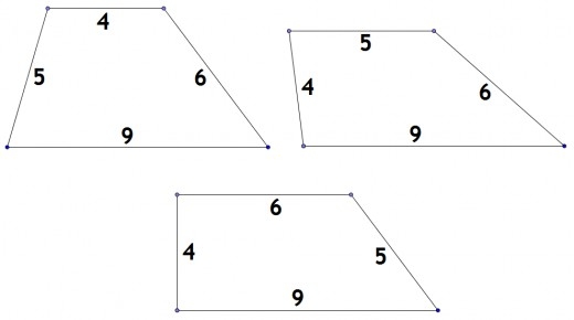 Thực tế nếu bài toán đưa ra câu hỏi cách tính 4 cạnh của hình thang khi biết 4 cạnh thì sẽ không có đáp án chính xác vì chỉ biết 4 cạnh thì có rất nhiều trường hợp xay ra và diện tích cũng khác nhau, các bạn có thể hình dung ví dụ hình thang dưới đây có 4 cạnh 4 5 6 9 có thể vẽ 3 dạng hình khác nhau với diện tích khác nhau.
