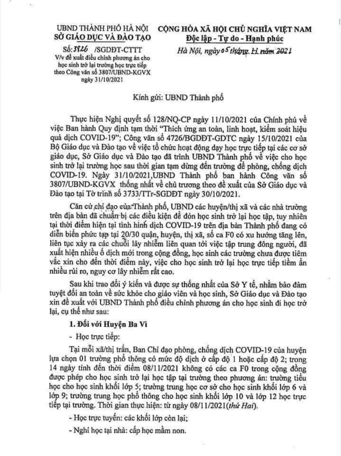 Mới đây UBND TP Hà Nội vừa có Văn bản số 3807/UBND-KGVX về việc cho học sinh trở lại trường học sau thời gian tạm dừng đến trường để phòng, chống dịch Covid-19. Ngày 6/11/2021, UBND TP. Hà Nội có Công văn số 3908/UBND-KGVX về việc điều chỉnh một số nội dung tại Công văn số 3807/UBND-KGVX ngày 31/10/2021 của UBND Thành phố.