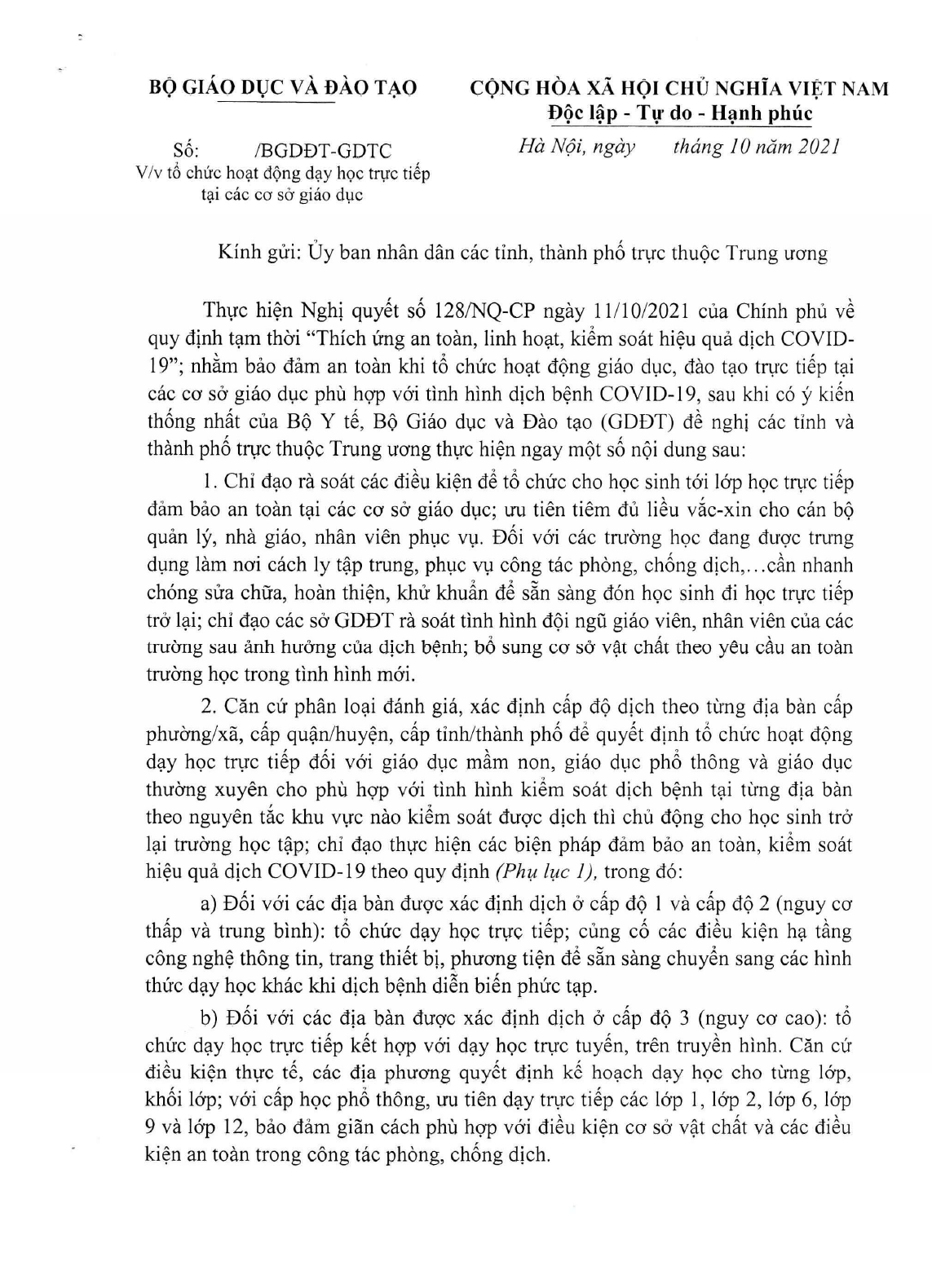 Bộ Giáo dục và Đào tạo (GDĐT) vừa ban hành công văn số 4726/BGDĐT-GDTC gửi Ủy ban nhân dân các tỉnh, thành phố về việc tổ chức hoạt động dạy học trực tiếp tại các cơ sở giáo dục.