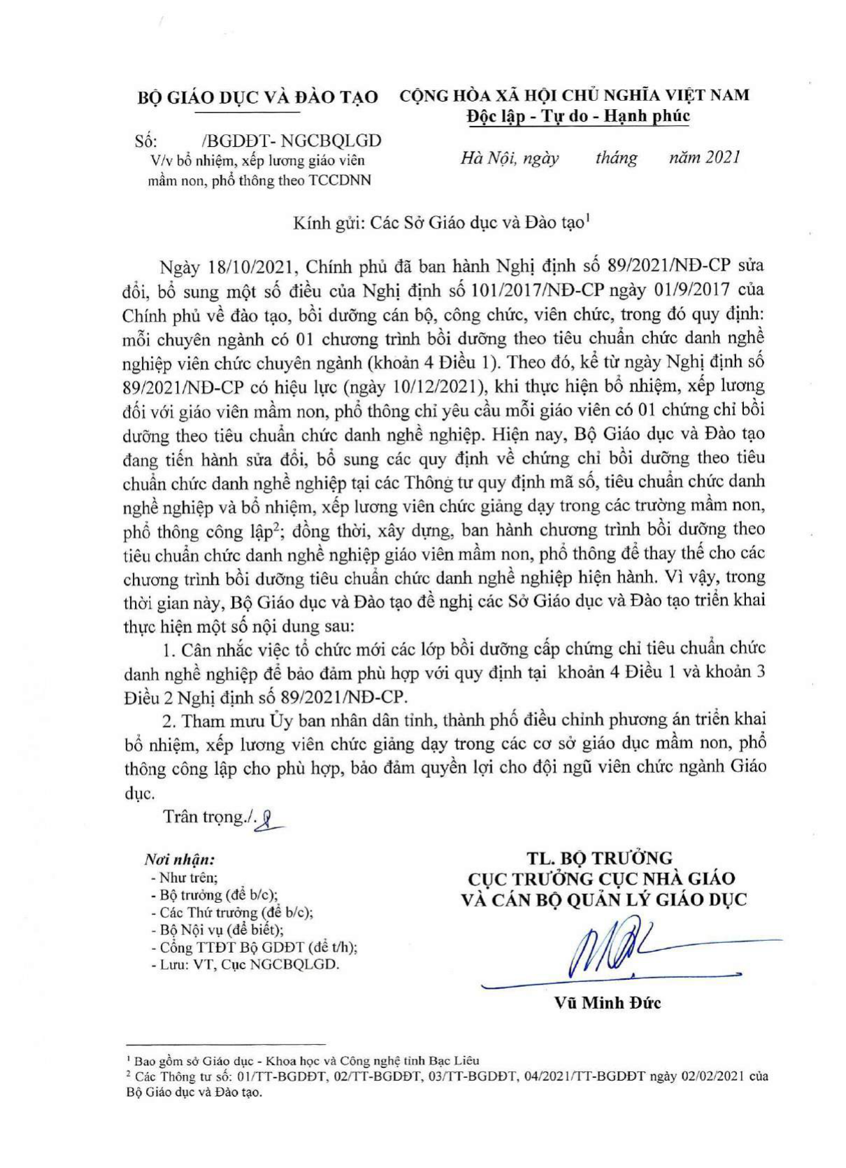 Ngày 18/10/2021, Chính phủ đã ban hành Nghị định số 89/2021/NĐ-CP sửa đổi, bổ sung một số điều của Nghị định số 101/2017/NĐ-CP ngày 01/9/2017 của Chính phủ về đào tạo, bồi dưỡng cán bộ, công chức, viên chức, trong đó quy định: mỗi chuyên ngành c ó 01 chương trình bồi dưỡng theo tiêu chuẩn chức danh nghề nghiệp viên chức chuyên ngành (khoản 4 Điều 1). Theo đó, kể từ ngày Nghị định số 89/2021/NĐ-CP có hiệu lực (ngày 10/12/2021), khi thực hiện bổ nhiệm, xếp lương đối với giáo viên mầm non, phổ thông chỉ yêu cầu mỗi giáo viên có 01 chứng chỉ bồi dưỡng theo tiêu chuẩn chức danh nghề nghiệp. Hiện nay, Bộ Giáo dục và Đào tạo đang tiến hành sửa đổi, bổ sung các quy định về chứng chỉ bồi dưỡng theo tiêu chuẩn chức danh nghề nghiệp tại các Thông tư quy định mã số, tiêu chuẩn chức danh nghề nghiệp và bổ nhiệm, xếp lương viên chức giảng dạy trong các trường mầm non, phổ thông công lập; đồng thời, xây dựng, ban hành chương trình bồi dưỡng theo tiêu chuẩn chức danh nghề nghiệp giáo viên mầm non, phổ thông để thay thế cho các chương trình bồi dưỡng tiêu chuẩn chức danh nghề nghiệp hiện hành. Vì vậy, trong thời gian này, Bộ Giáo dục và Đào tạo đề nghị các Sở Giáo dục và Đào tạo triển khai thực hiện một số nội dung sau: