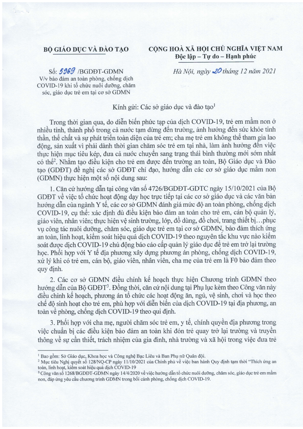 Bộ Giáo dục và Đào tạo (GDĐT) vừa ban hành công văn số 5969/BGDĐT-GDMN gửi các sở GDĐT về việc bảo đảm an toàn phòng, chống dịch COVID-19 khi tổ chức nuôi dưỡng, chăm sóc, giáo dục trẻ em tại cơ sở giáo dục mầm non.