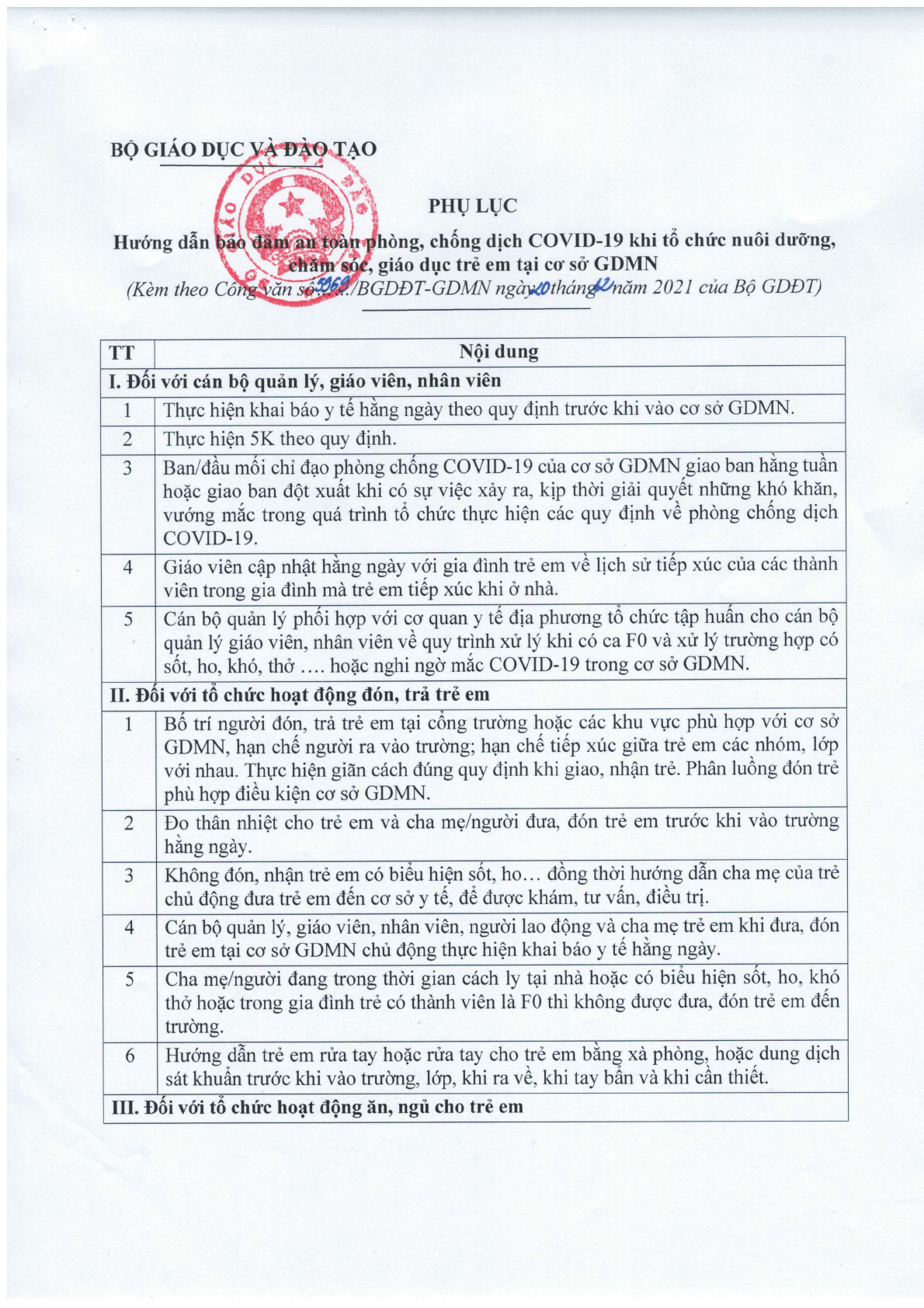 Nhằm tạo điều kiện cho trẻ em được đến trường an toàn, Bộ GDĐT đề nghị các sở GDĐT chỉ đạo các cơ sở giáo dục mầm non căn cứ hướng dẫn tại công văn số 4726/BGDĐT-GDTC ngày 15/10/2021 của Bộ GDĐT về việc tổ chức hoạt động dạy học trực tiếp tại các cơ sở giáo dục và các văn bản hướng dẫn của ngành Y tế, các cơ sở giáo dục mầm non đánh giá mức độ an toàn phòng, chống dịch COVID-19.