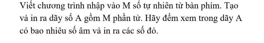 . Tạo và in ra dãy số A gồm M phần tử. Hãy đếm xem trong dãy A có bao nhiêu số âm và in ra các số đó