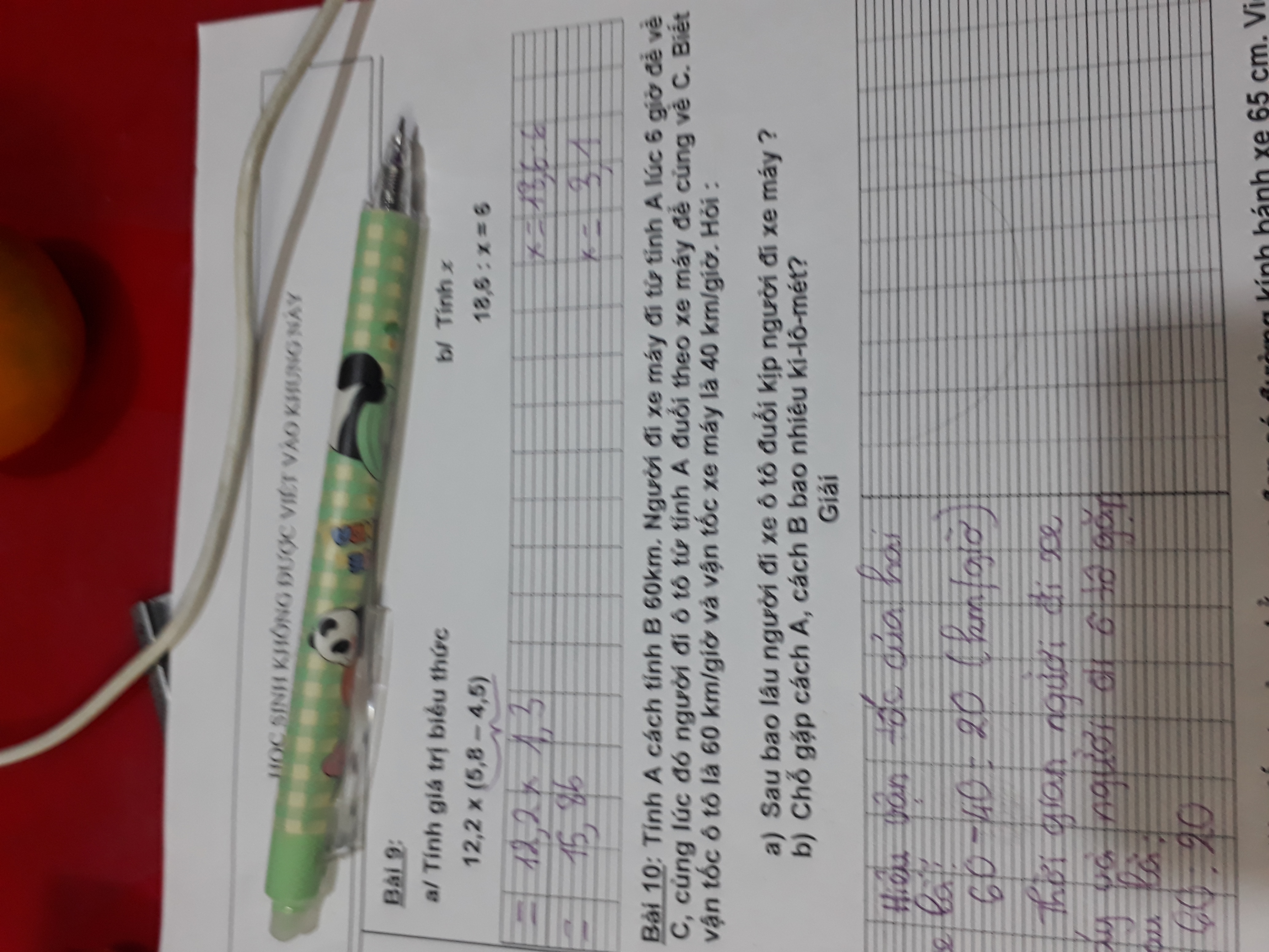 , cùng lúc đó, người đi ô tô từ tỉnh A đuổi theo xe máy để cùng về C. Biết vận tốc ô tô là 60km/h và vận tốc xe máy là 40 km/h.