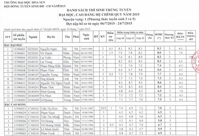 Đại học Hóa Sen đã công bố danh sách 38 thí sinh trúng tuyển vào trường năm 2015. Đây là những thí sinh trúng tuyển theo 2 phương thức: xét tuyển trên kết quả học tập 3 năm THPT và chứng chỉ anh văn quốc tế (ĐH và CĐ); xét tuyển trên kết quả học tập 3 năm THPT và phỏng vấn (bậc CĐ).