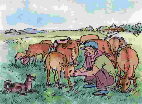 Giống như những đứa trẻ quấn quýt bên mẹ, đàn bê cứ quẩn vào chân Hồ Giáo. Chúng vừa ăn vừa đùa nghịch. Những con bê đực, y hệt như những bé trai khoẻ mạnh, chốc chốc lại ngừng ăn, nhảy quẩng lên rồi chạy đuổi nhau thành một vòng tròn xung quanh anh ... Những con bê cái thì khác hẳn. Chúng rụt rè chẳng khác nào những bé gái được bà chiều chuộng, chăm bẫm, không dám cho chạy đi chơi xa ... Chúng ăn nhỏ nhẹ, từ tốn. Thỉnh thoảng, một con, chừng như nhớ mẹ, chạy lại chỗ Hồ Giáo, dụi mõm vào người anh nũng nịu. Có con còn sán vào lòng anh, quơ quơ đôi chân lên như là đòi bế.