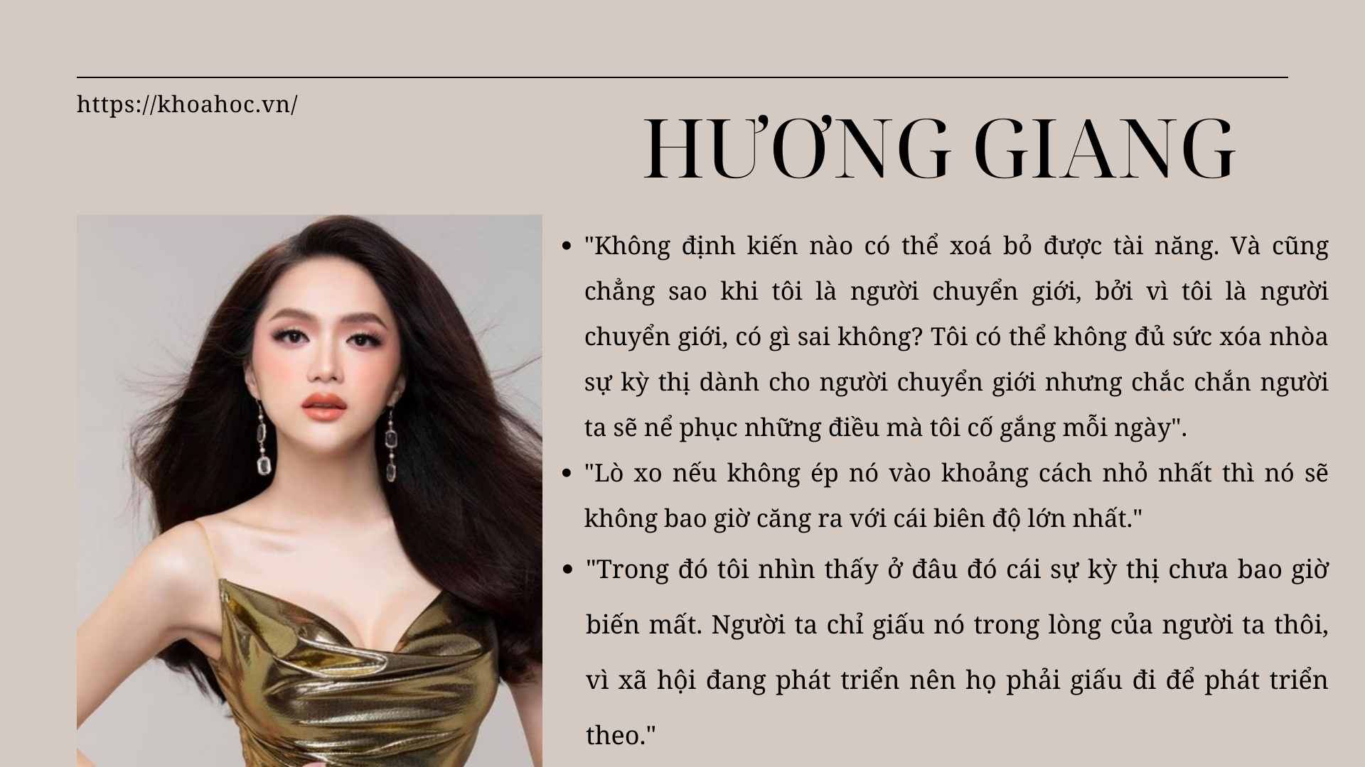 - Từ cậu bé Nguyễn Ngọc Hiếu mê búp bê, mê làm đẹp, mê ca hát đến Hoa hậu chuyển giới quốc tế, Hương Giang Idol đã phải trải qua hành trình vượt qua cả những cơn đau về thể xác lẫn tinh thần.