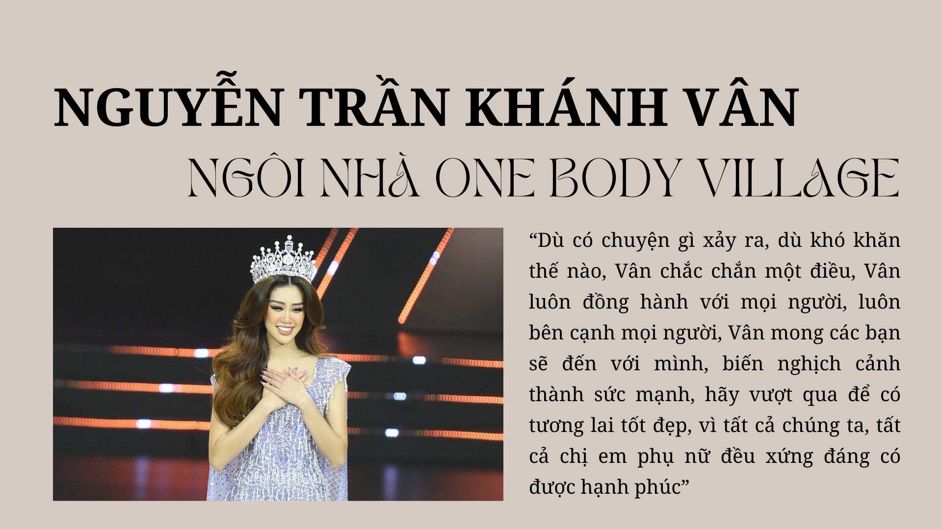 - Từ câu chuyện từng là nạn nhân của 1 vụ xâm hại bất thành, Khánh Vân luôn đau đáu về vấn nạn xâm hại tình dục ở trẻ em gái, cô đã quyết định đồng hành cùng các em ở ngôi nhà One Body Village. Hoa hậu Khánh Vân đã đến thăm các trẻ em gái và tìm hiểu, chia sẻ câu chuyện của những trường hợp bị xâm hại tình dục. Đồng thời, cô hy vọng các trẻ em gái và phụ huynh cùng đồng hành với cô tạo nên tiếng nói chung để bảo vệ nhau.