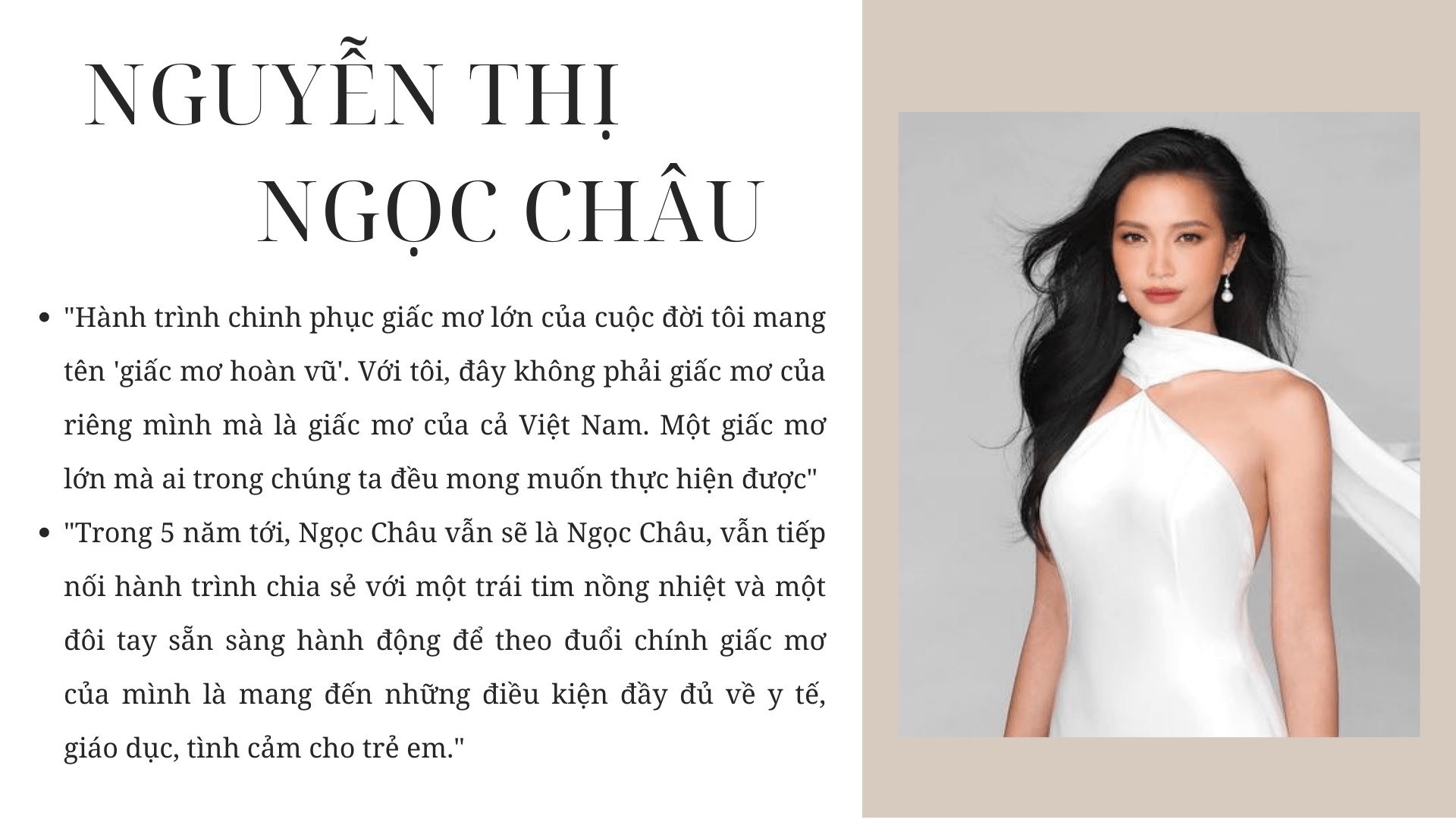 - Khi đăng quang Hoa hậu Hoàn vũ Việt Nam, ới số tiền thưởng 300 triệu đồng, Ngọc Châu cho biết sẽ dùng 70% để thực hiện các dự án về sức khỏe, giáo dục cho trẻ em, đồng thời hỗ trợ các bé mồ côi sau Covid-19. Số tiền còn lại cô dùng vào việc trau dồi, hoàn thiện bản thân.