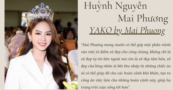 - Dự án “Công ty YAKO by Mai Phuong” là một công ty phi lợi nhuận và sẽ được vận hành lâu dài bởi Hoa hậu Mai Phương, cung cấp các mặt hàng thời trang bao gồm: áo thun, crop-top và hoodie. Lợi nhuận sẽ được dùng cho các dự án nhân ái trong nước, chăm sóc y tế và trích một khoản để gửi vào quỹ từ thiện Miss World.